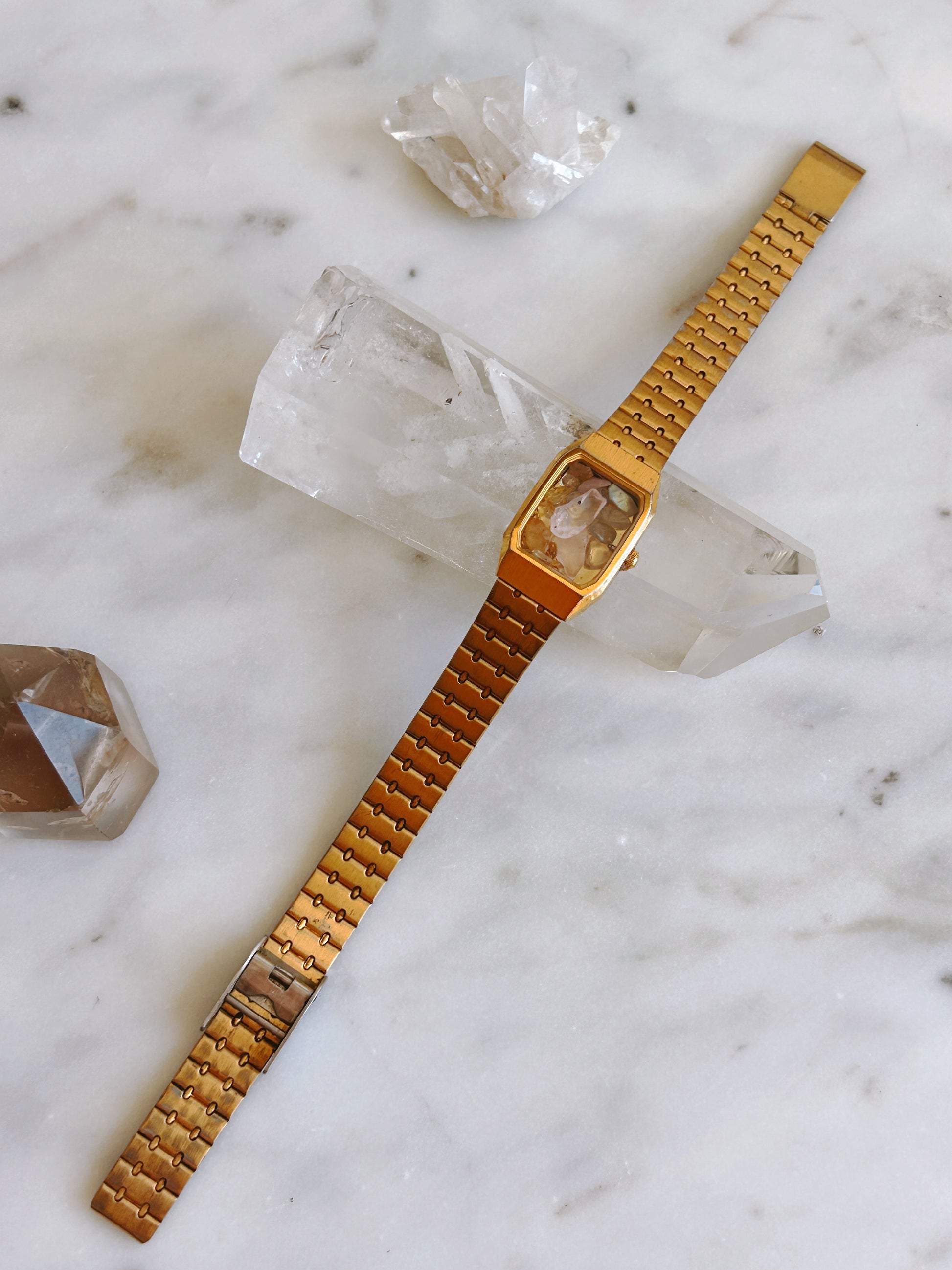 Notice the magic and synchronicities all around you with this crystal watch. This classic gold watch is meticulously filled by hand with ethically sourced crystals, each crystal containing special abilities and magical properties. A mix of rose quartz, citrine, moonstone and clear quartz.