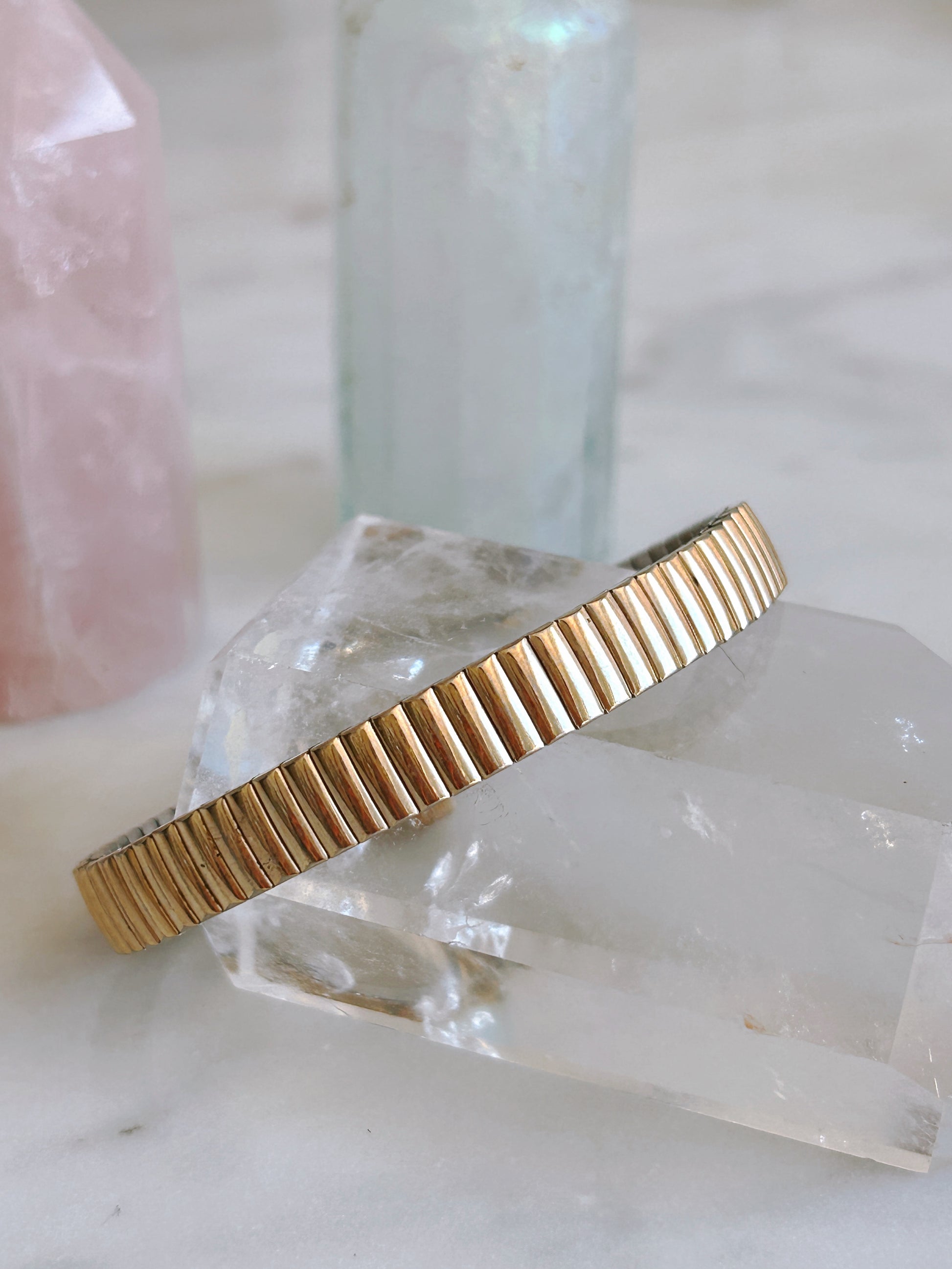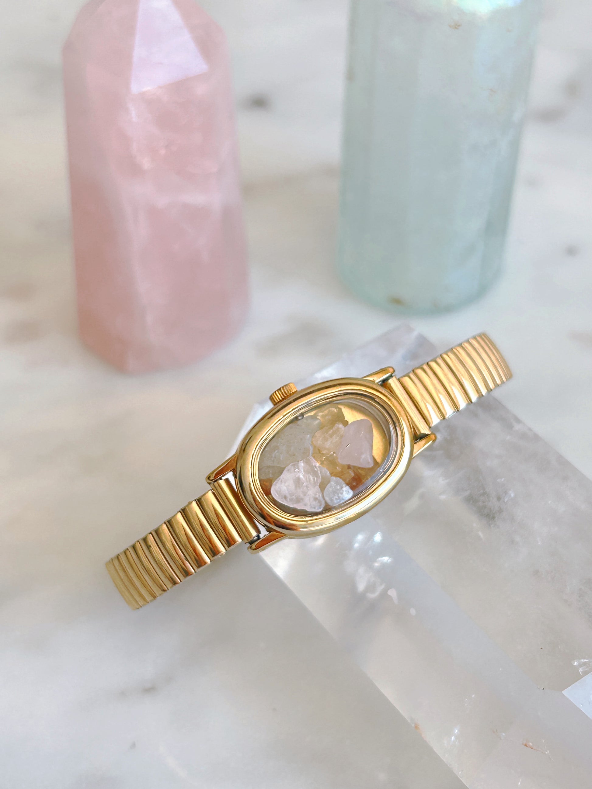 New beginnings are on the way to you! This classic gold expansion is meticulously filled by hand with ethically sourced crystals, each crystal containing special abilities and magical properties. A mix of rose quartz, citrine, moonstone and clear quartz.